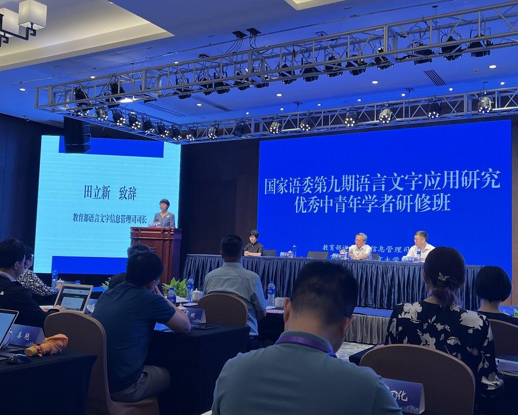 经公司国家语言文字推广基地推荐、教育部语言文字信息司审定,基地成员辛亚宁于2023年7月24日至29日参加了国家语委第九期语言文字应用研究优秀中青年学者研修班。本次培训由教育部语言文字信息管理司主办,南京大学中国语言战略中心承办,教育部教育部语言文字信息司司长田立新参加开班仪式并致辞,共有来自全国各高校从事语言文字工作的81位学员参加了本次培训。