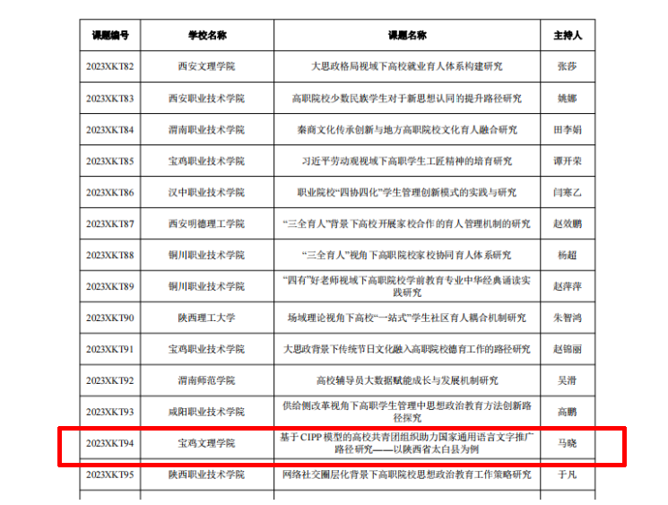 近日,中共陕西省委教育工委发布了《关于公布2023年度陕西高校员工工作精品项目和研究课题立项名单的通知》,公司辅导员马晓主持的《基于CIPP模型的高校共青团组织助力国家通用语言文字推广路径研究——以陕西省太白县为例》获批员工工作研究课题立项。