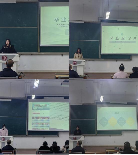 接着,四位优秀实习生代表分别从实习单位、实习经历和实习收获三个方面对实习进行了总结。在贵州广播电视台融合创新部实习的周家悦同学向大家分享了她在实习工作中遇到的困难,以及如何转变思维成为一名合格的职场人的经验,也为下一级的同学提供了有效的实习建议。在镇宁布依族苗族自治县融媒体中心实习的赵雨芳同学则感叹,一旦进入到实习岗位,就会有很强的责任感,意识到自己身负重任,即使有时接到的任务有难度,也能想尽办法克服。在西安字节跳动公司实习的赵乐乐同学分享了在该公司实习的三个阶段,这三个阶段分别考验实习生不同的工作能力,与此同时也能够获得大大的提升。她也为所有对实习就业感到迷茫的同学指出,只要找对方向,实习生也能够在企业中获得成长与滋养。高楠同学对她在延安市安塞区融媒体中心的实习工作做了详细的说明,并展示了她在实习期间的独立作品。同学们普遍认为,专业实习提高了实际工作的能力,为就业和将来的工作取得了一些宝贵的实践经验。同时,实习经历还是日后进入职场的一次演练,有助于开拓眼界,积累人脉资源,帮助他们更好的适应社会。