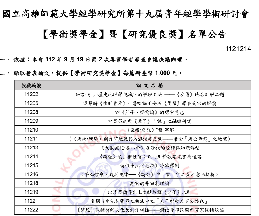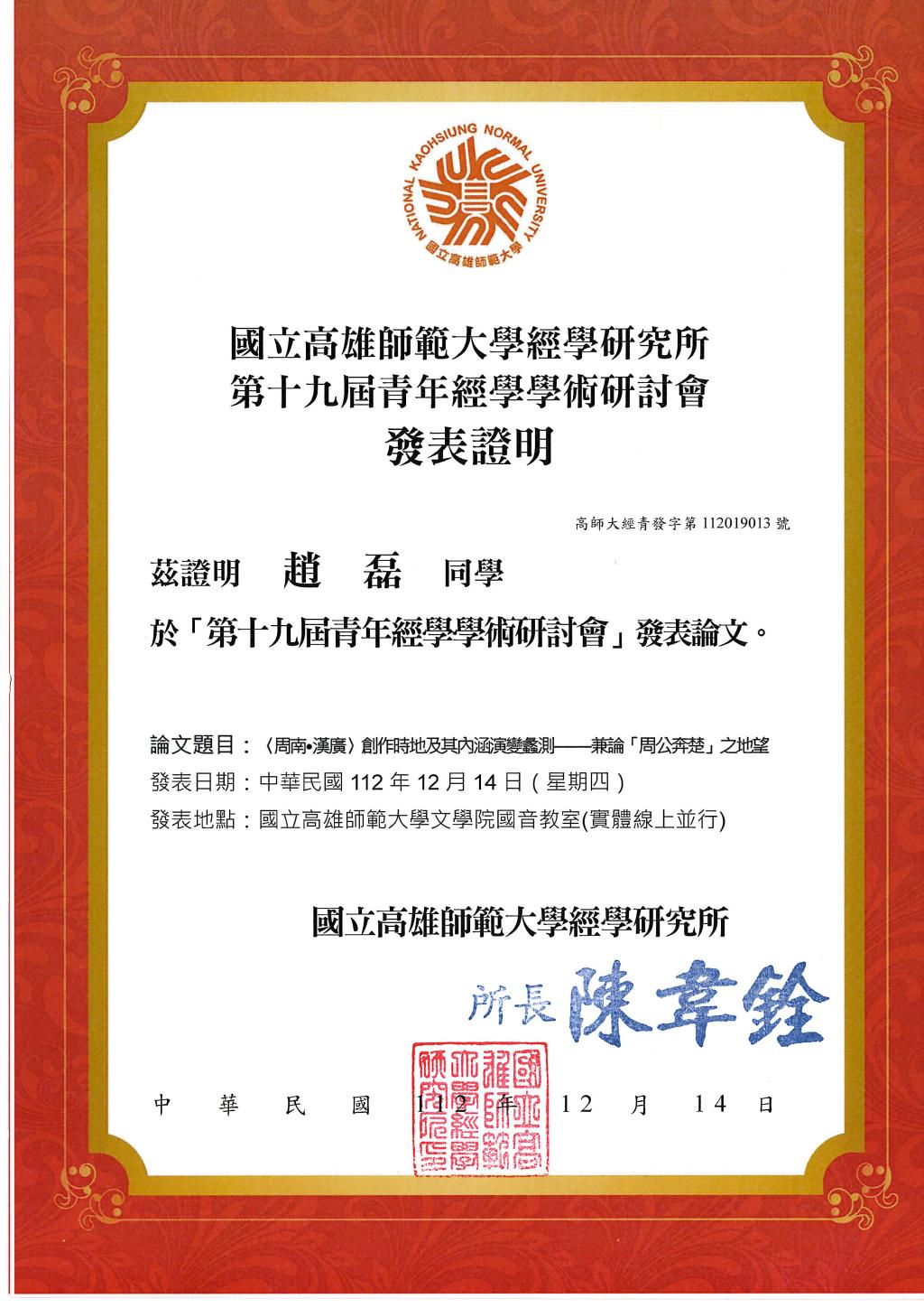 近日,公司2021级学术硕士赵磊(导师:王渭清老师)撰写的《<周南·汉广>创作时地及其内涵演变蠡测》学术论文被台湾高雄师范大学会议录用。赵磊应邀于线上参加了高雄师范大学举办的“第十九届青年经学学术研讨会”,并宣读了论文。与来自大陆的北京大学、清华大学、中国人民大学、英国365集团官网、中山大学及台湾政治大学、香港理工大学、高雄师范大学等校14位论文入选的博士、硕士进行了学术交流。