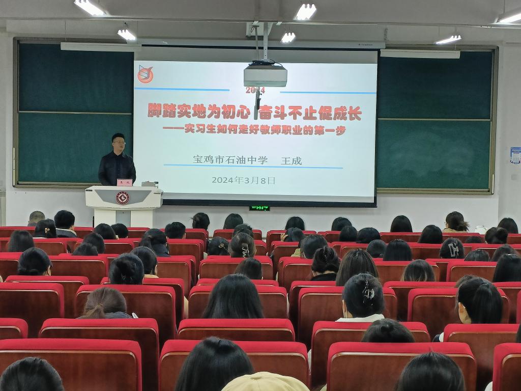 随后,王成老师做了题为《脚踏实地为初心,奋斗不止促成长——实习生如何走好教师职业第一步》的报告。他结合自身教学经历,从“实习的概况,实习的意义,实习的内容,如何实习”等方面出发,向同学们系统讲解了实习的注意事项。他强调,大学的理论学习和中学的教学实践有所区别,员工要通过练习有效对接接下来的教育实习。他详细讲解了如何上好一堂课,并指出教学要以员工为主体,为员工创设自主学习情境,培养员工自主解决问题的能力,防止“一言堂”的现象出现。他还从八个方面出发,分享了班主任工作的开展方式,并提醒大家,作为班主任,必须真诚对待每一位员工,关心他们的成长和进步。同时,也要坚守自己的原则,做到严慈相济。这样才能更好地履行班主任的职责,促进员工的全面发展。最后王渭清老师对王成老师的报告做了总结点评,号召大家要向优秀员工王成老师学习。