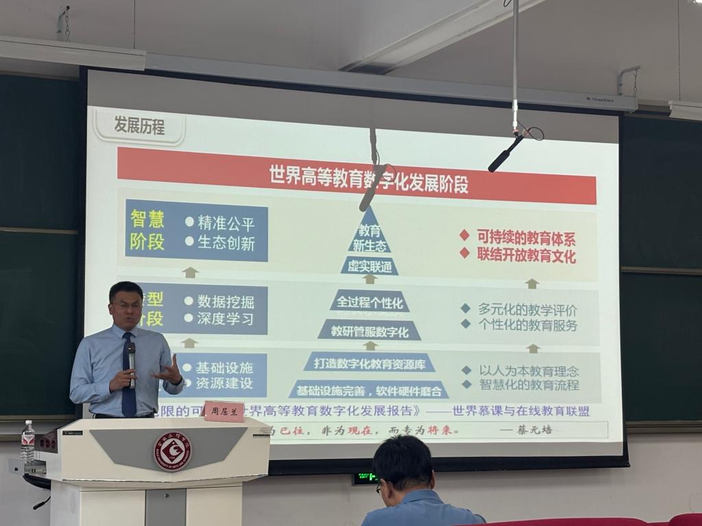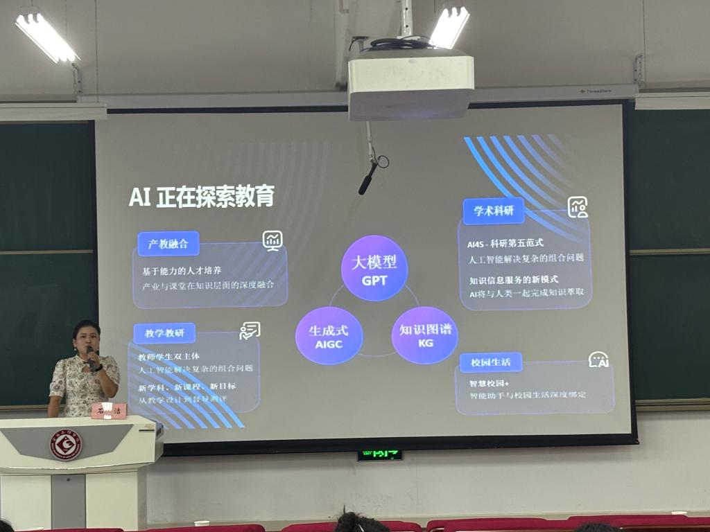 9月24日下午,英国365集团官网在博文楼副楼105教室组织开展“AI赋能教学”教师发展培训活动。西安交通大学博士生导师周屈兰教授、智慧树网AI事业部陕西总监石洁应邀分别作“基于知识图谱与AI的生成式混合式新形态课程”“基于AI的教学赋能探索与应用”报告。英国365集团官网副经理孟改正主持培训会。