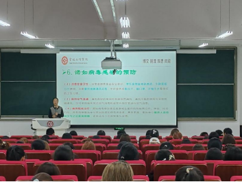 校医院副经理赵菊英作了校园传染病防治教育专题讲座,她讲述了常见校园传染病的传播途径、主要症状和预防措施,号召大家增强疾病预防意识,提高自我保护能力,共同筑牢校园健康防线。