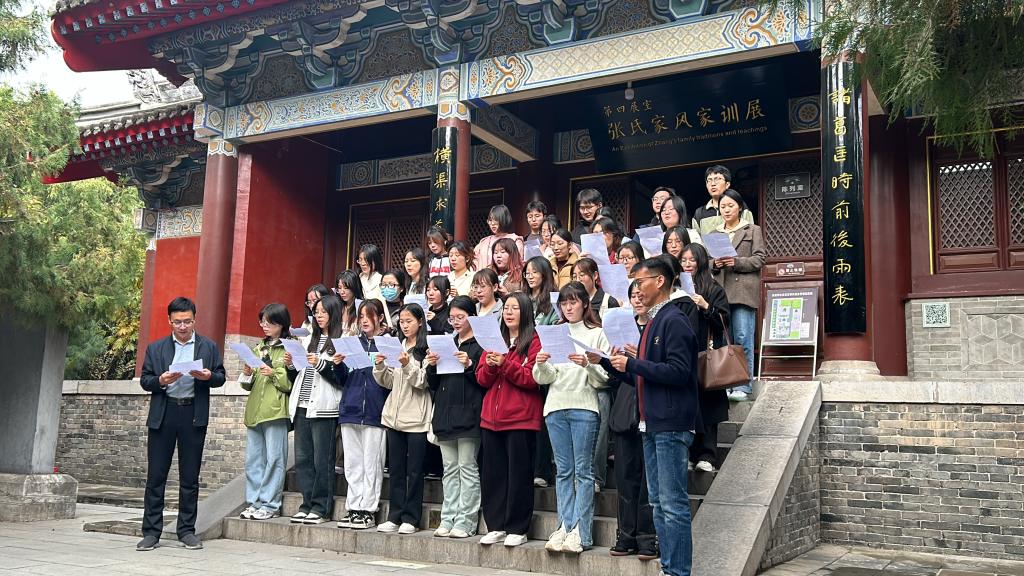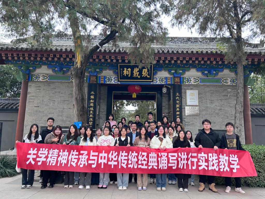 活动六:关学精神传承与中华传统经典诵写讲行实践教学。11月2日,汉语言文学和编导专业40余位同学前往宝鸡市张载祠、六艺坊开展关学精神传承与中华传统经典诵写讲行实践教学活动。在张载祠内,王俊老师带领全体同学朗诵了张载语录。副经理孟改正现场讲授“传承中华优秀文化,为中华民族伟大复兴贡献青春力量”微党课,阐发了张载“四为”精神的当代价值,号召师范生继承和发扬“四为”精神,争做新时代“四有”好老师。两位员工代表发言交流。此次活动让同学们感受到张载“为天地立心”的宏大志向、“为生民立命”的责任感、“为往圣继绝学”的文化担当以及“为万世开太平”的伟大抱负,激励同学们树立崇高理想,成为有家国情怀和历史担当的人。在六艺坊,师生参观了解“礼、乐、射、御、书、数”,感悟传统素质教育与人格养成。