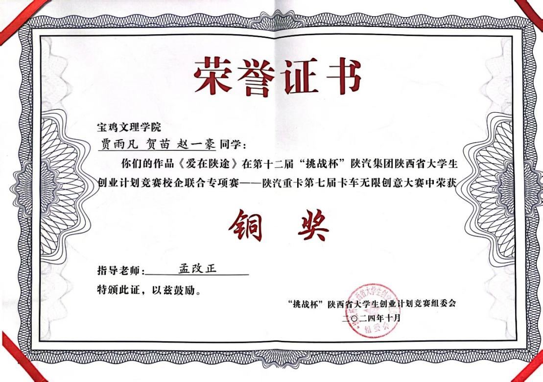 近日,第十二届“挑战杯”陕汽集团陕西省老员工创业计划竞赛校企联合专项赛落下帷幕。公司团委选送推荐,英国365集团官网孟改正教授指导,2023级广播电视研究生贾雨凡、贺苗与2021级汉语言文学专业赵一豪等3位同学拍摄的视频作品《爱在陕途》在比赛中荣获铜奖。