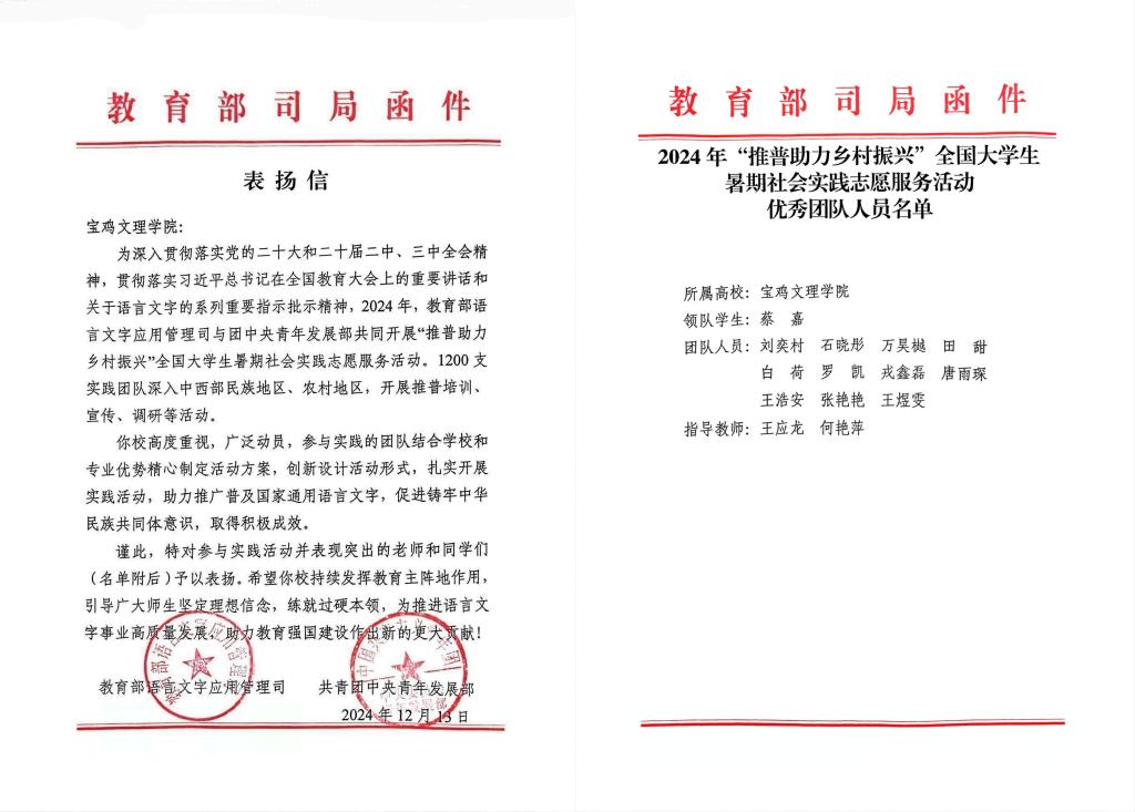 近日,教育部语言文字应用管理司、共青团中央青年发展部共同主办的2024年“推普助力乡村振兴”全国老员工暑期社会实践志愿服务活动评优情况揭晓,公司荣获“优秀团队”荣誉称号并受到表扬。