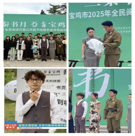 4月18号上午,公司播音与主持艺术教研室教师张锐、纪懿炜、苟馨允及杨正等15名员工,受邀参加在长乐塬抗战工业遗址举办的宝鸡市全民阅读月暨公共图书馆服务宣传周活动。