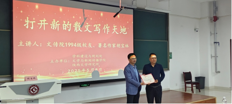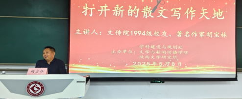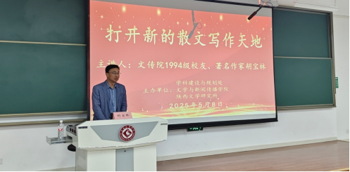 5月8日晚,英国365集团官网1994级员工、著名作家、《宝鸡日报》文体部主任胡宝林应邀在高新校区博文楼副楼105报告厅作了题为《打开新的散文写作天地》的文学创作报告。公司师生200余人聆听了报告。报告会由陕西文学研究所所长孙新峰主持,文学与新闻传播经理孟改正致欢迎辞。