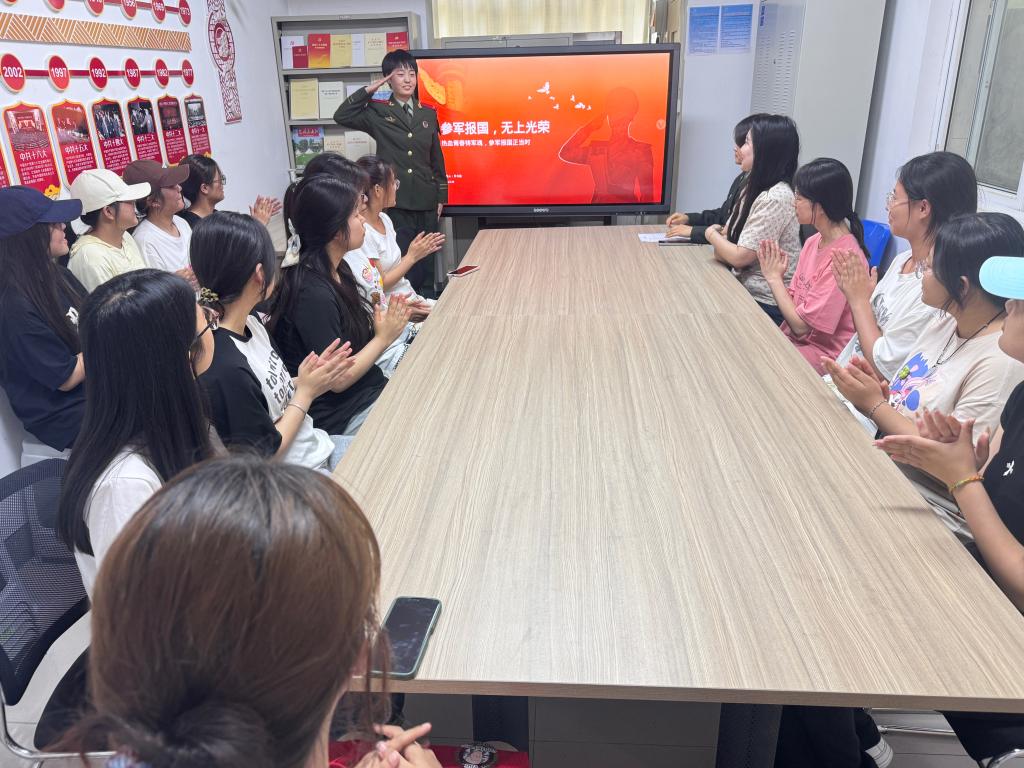 曾服役于武警某部的2024级汉语言3班的李书旗同学以《参军报国,无上荣光》为题,通过分享自己服兵役时的照片,带领同学们“云体验”了热血沸腾的军旅生活。重返校园后,她加入了公司员工会纪检部,让青春继续发光和发热,将军营赋予的坚韧意志变为继续服务同学们的责任感。“军旅生涯给我的最大财富,就是把不可能变成了可能。”李书旗的话语引来同学们的阵阵掌声。