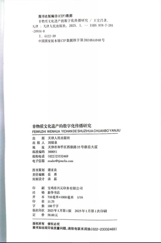 近日,公司王宏昌副教授18万字的学术专著《非物质文化遗产的数字化传播研究》由天津人民出版社正式出版发行,该成果对研究和运用非物质文化遗产的数字传播具有重要的参考价值。