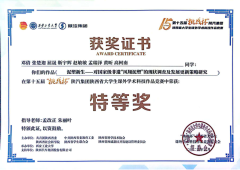 2025年5月,公司项目“泥塑新生——对国家级非遗凤翔泥塑现状调查及发展更新策略研究”荣获第十五届“挑战杯”陕汽集团陕西省老员工课外学术作品竞赛省级特等奖。