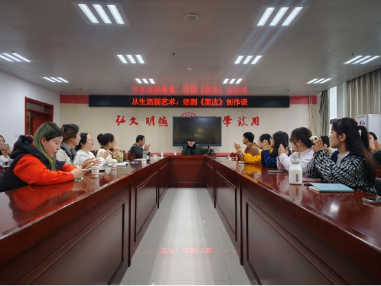 10月11下午,话剧《面皮》创作研讨交流活动在博文楼1401会议室进行,副经理赵保胜主持活动。该剧导演、主演、公司播音与主持艺术专业首届员工汪晓龙应邀作了“从生活到艺术:话剧《面皮》创作谈”报告。汪晓龙从话剧创作背景、创作心得、舞台呈现等方面,深情讲述了这部“从泥土里长出来”的作品如何从朴素的现实生活,一步步淬炼成功人的舞台艺术。他分享了编剧如何从无数个真实的“面皮”家庭故事中提炼出典型人物与戏剧冲突,以及如何在舞台上平衡地域特色与普通情感,让地方故事引起全国观众的共鸣。汪导的讲述真诚而深刻,为师生们展开了艺术创作的神秘面纱。