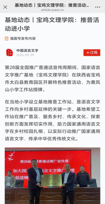 近日,公司国家语言文字推广基地在陕西宝鸡太白县黄凤山小学开展的推普活动获“中国语言文字”强国号关注报道。这充分展现出基地在乡村小学语言文字推广与文化传承中的实践成效。