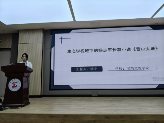 在硕士论坛环节,公司现当代文学专业研究生韩宇做了题为“生态视阈下杨志军长篇小说《雪山大地》”的交流报告。她从生态文学视角解读了作品的思想内涵与艺术价值,展现出了扎实的学术功底与独特的研究视角。