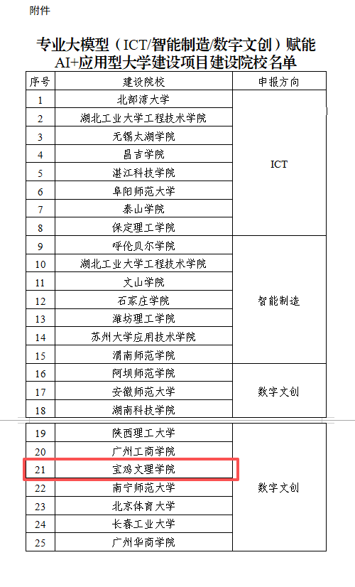 教育部“专业大模型赋能AI+应用型大学建设项目”旨在推动人工智能前沿技术与高等教育的深度融合,聚焦培养具备AI素养、创新能力和实践技能的高素质应用型人才,通过引入ICT(信息通信技术)、智能制造、数字文创等领域的专业大模型,赋能应用型大学在团队建设、人才培养、科研创新等方面实现跨越式发展。