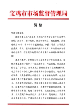 近日,第二届陕西省“新发展 陕西范”公益广告大赛结果揭晓,公司师生获二等奖1项、三等奖3项、优秀奖3项。宝鸡市市场监管局发来贺信。