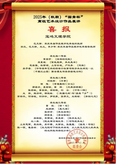 近日,2025年“国青杯”全国高校艺术设计作品评奖活动结束。公司师生获一等奖4项、二等奖6项,三等奖8项。范文静老师荣获“优秀组织教师”称号,孙立、范文静、王兰、李少华老师获评“优秀指导教师”。