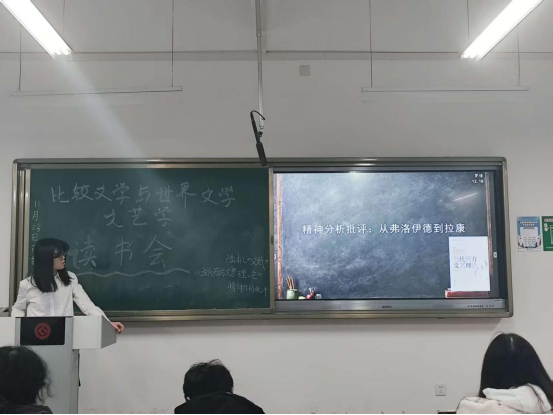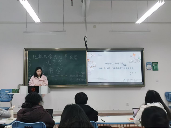 甘甜同学对两位分享者的发言进行评议,肯定其框架完整、逻辑清晰,并提出“陆机‘缘情说’与西方浪漫主义‘情感论’异同”“拉康理论对弗洛伊德无意识理论的改造”等问题,引发现场热烈讨论。