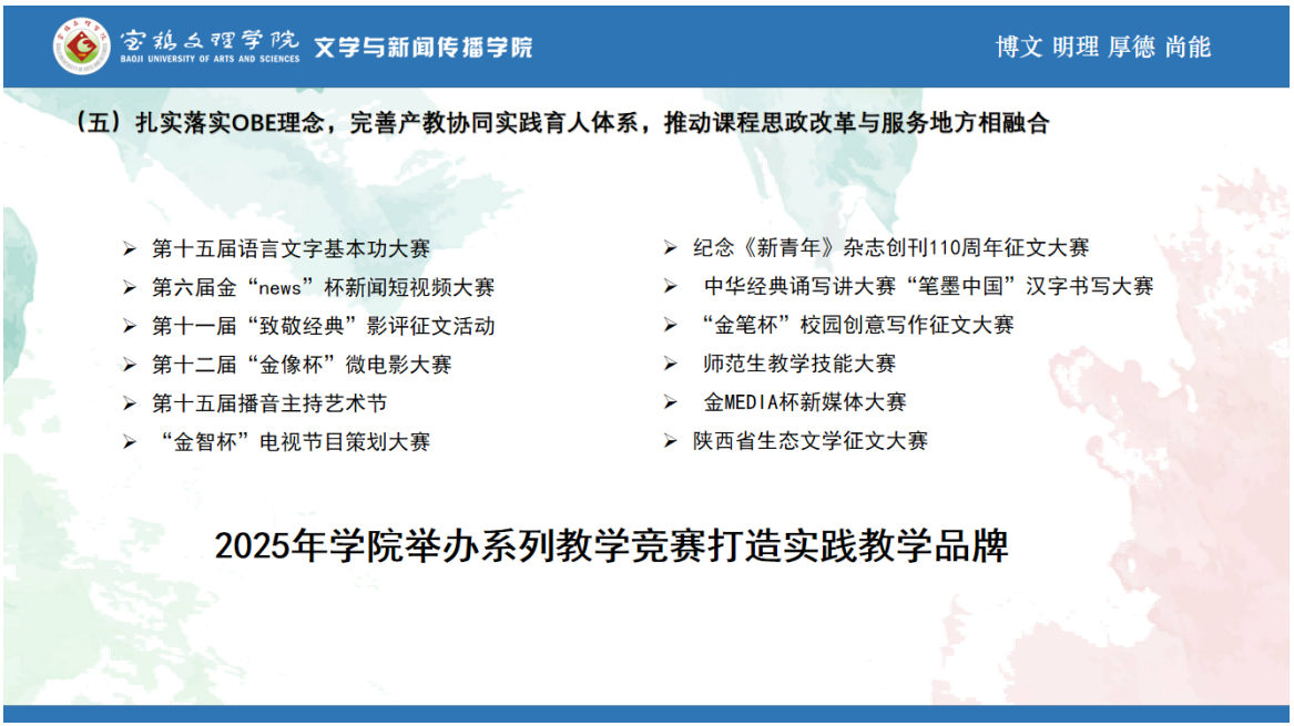 公司以人才培养为核心,全面落实OBE理念。修订2025版人才培养方案,以卓越人才培养为抓手,强化“两性一度”课堂教学改革。2025年开展“卓越传媒人才培养暨微专业建设”主题实践教学活动;举办第十五届播音主持艺术节暨《古今一戏・周商品鉴》原创话剧展演;10月至12月,开展卓越师范人才培养系列活动7场,组织师范专业师生赴宝鸡7所中学开展教育见习活动,赴渭滨中学开展“名师引领,送培进校”研修一体化活动。