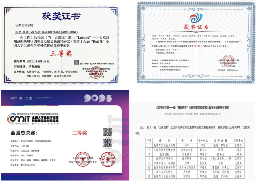 2025年《中国古代文学名作导读》获批国家一流课程,继续建设3门省级一流课程,新建2门院级智慧课程。举办了教师教学创新大赛、AI赋能公司产品能力提升工作坊等活动。2025年全院教师22人次外出培训提升,全面提升了教师公司产品能力;汇编《教改论文集》《课程思政案例集》,修订2025版教学大纲,实现课程思政全覆盖。获批陕西省首批卓越教师培养计划改革试点项目,获批校级教改项目4项、教学质量奖1人,省级重点教改项目1项通过验收,校级教学成果一等奖1项、三等奖2项。这些举措有效促进了教学从“知识传授”向“能力赋能”转型,为卓越人才培养奠定了坚实基础。