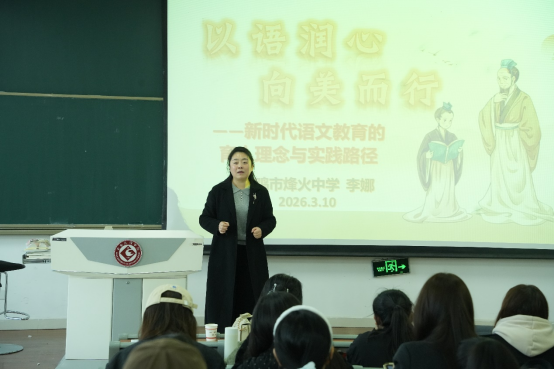 烽火中学语文高级教师李娜作了题为《以语润心 向美而行——新时代语文教育的育人理念与实践路径》的报告。李娜老师立足学科立场与育人理念,结合课程思政要求,以鲜活的案例深度阐释语文公司产品“立言立人”的内核,为同学们呈现了兼具理论高度与实践温度的教育指导。
